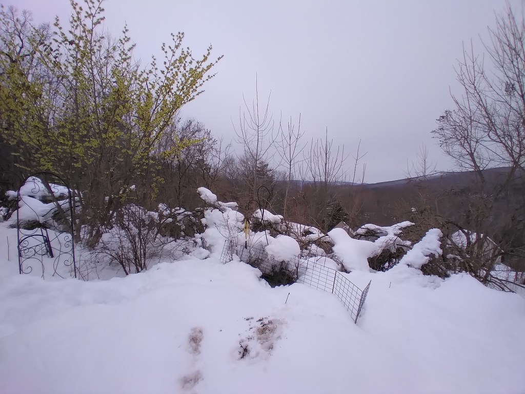 Elsewhere in the garden, a few branches of the large azalea have popped up, but the rest is still crushed together under the snow, along with a second azalea. The row of ancient lilacs are showing many broken branches, but others have reasserted themselves, so it’s another case of time will tell. The very large and overgrown forsythia I affectionately call “the yellow monster” is hidden beneath a flattened, white mound. The rest of the garden is in time-will-tell mode.