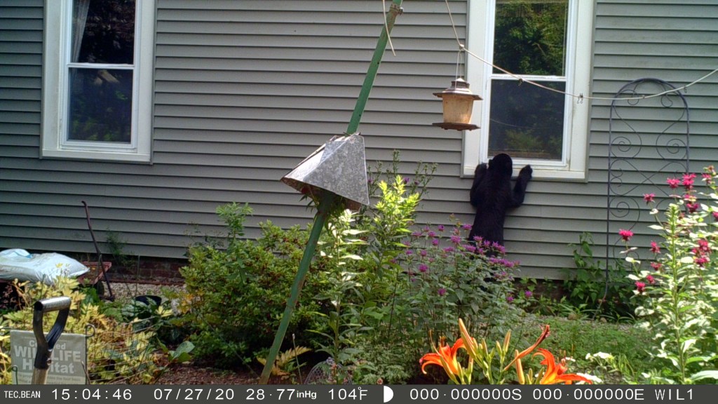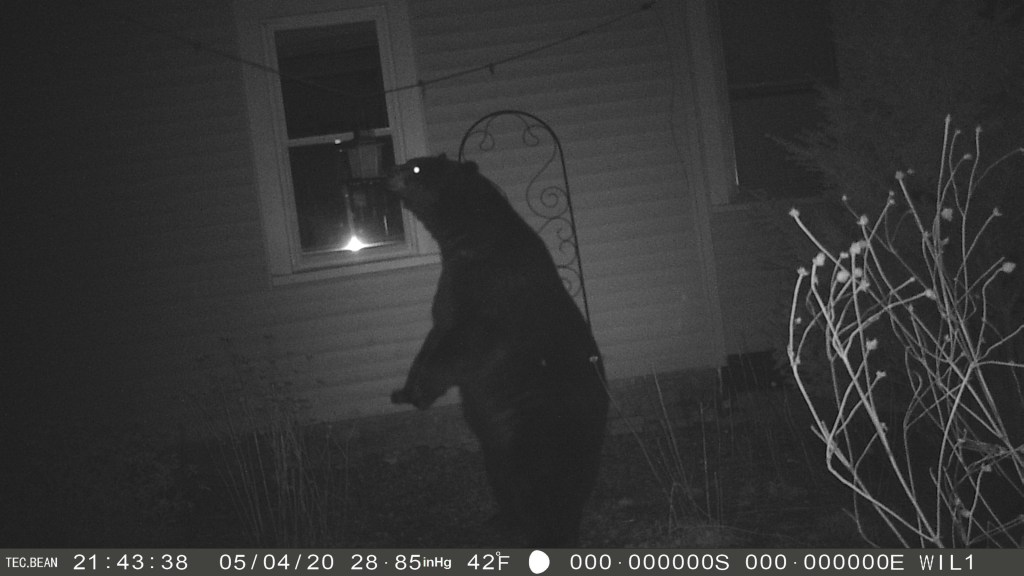 When I added game cameras to the yard a few years back, I was surprised at the number of nighttime visitors. What surprised me more was when they visited during the day. The sight of a large bear a few feet from my parlor window is a bit disconcerting and a very good reason to look around the yard before I head out to garden. Fortunately, the “wildest” critters I’ve run across unexpectedly out there have been an opossum and a skunk. The possum froze and when I didn’t move, continued on its way. The skunk I chose to quietly back away from and both of us left the encounter without making it a traumatic moment.