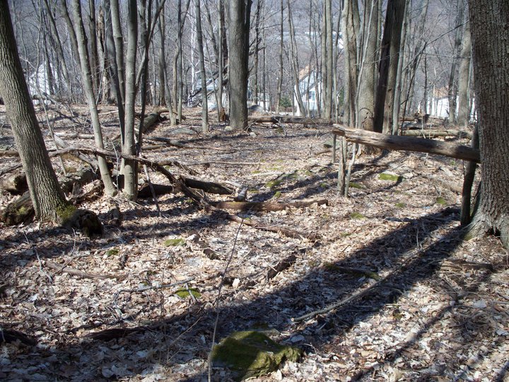 The only green in the woods is on the moss-covered stones or the occasional pine tree.