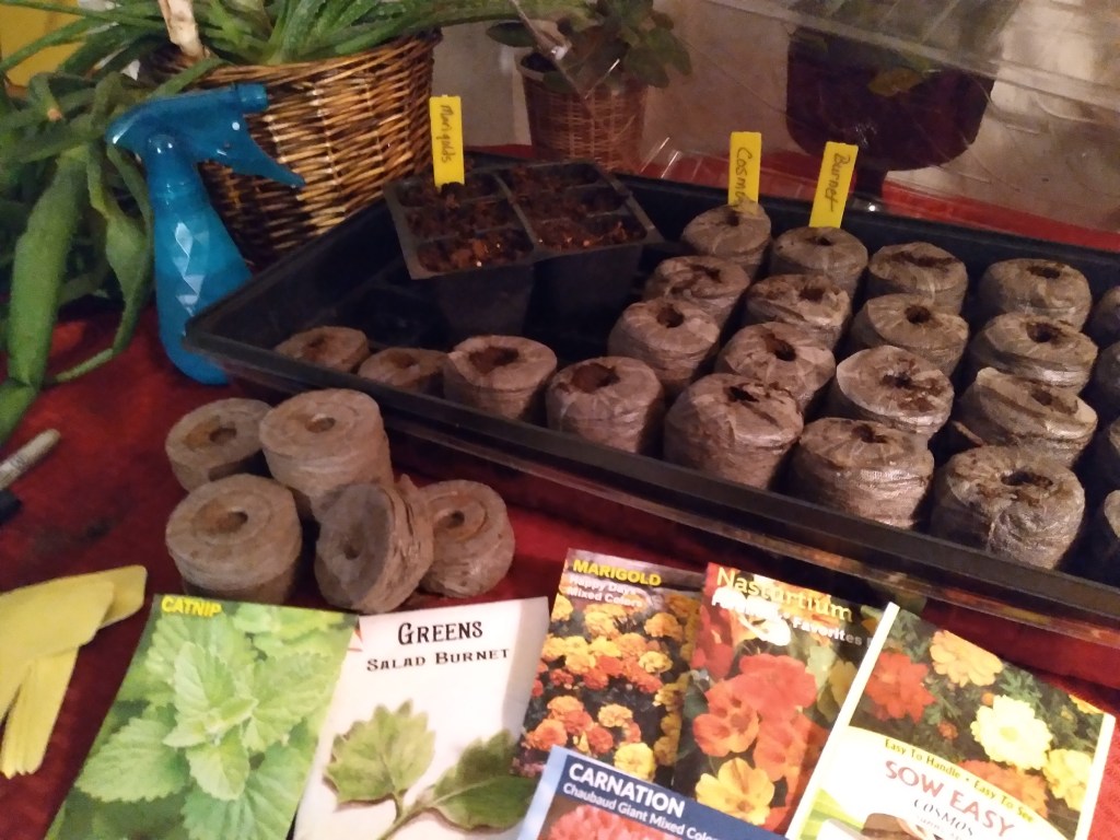 Since I indulged in so many seeds, I’m also starting some more traditionally using peat pellets and a seed starting mix. Those will go on my light stand, temporarily causing a bit of crowding among the African violets and other plants that usually make their home there. But that’s a temporary problem, just until the sunroom warms up and I can move the seedling out there into the sunlight.