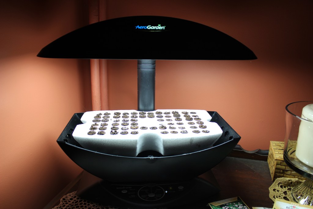 The first batch will be started in my Aerogarden, a handy hydroponic system that does an awesome job of starting seeds. The beauty of this system is that the grow light is focused on the growing area and is height adjustable as the seeds sprout and grow. By the time they’re big enough to pot up, it should be warm enough to move them out to the unheated sunroom where they’ll get plenty of sun until they’re ready to move outdoors.