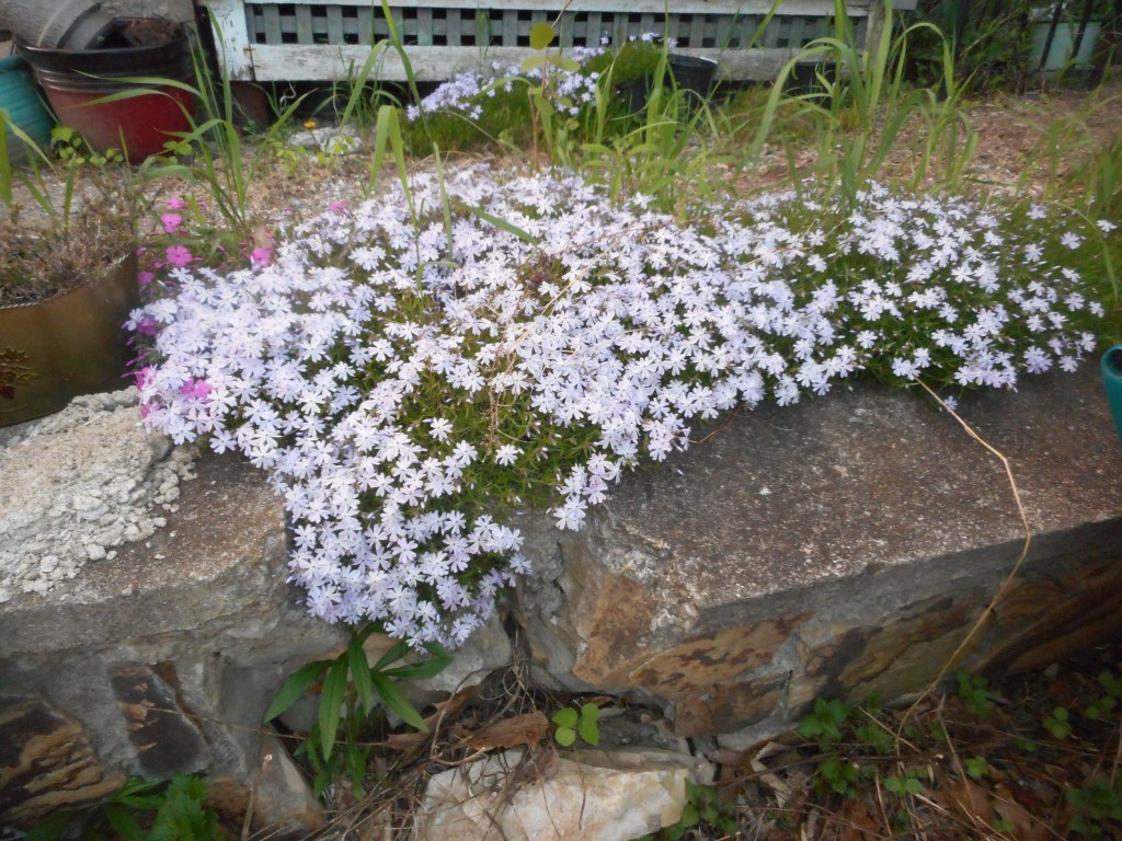 The moss phlox (Phlox subulata) doesn’t mind the weeds.